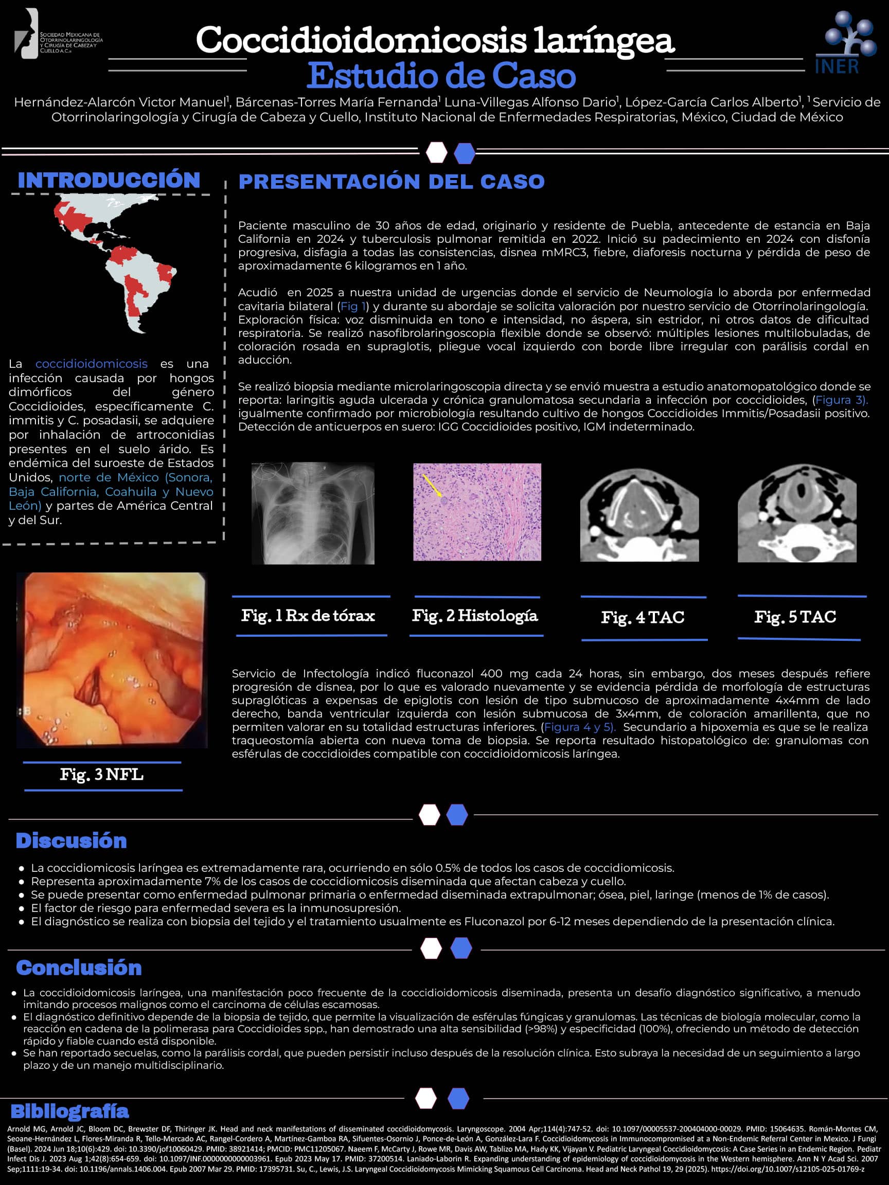 Objetivo: exponer un caso de interés médico. Tipo de estudio: reporte de caso clínico. Materiales y métodos: se realiza revisión del expediente clínico electrónico. Resultados: paciente masculino de 30 años, originario y residente de Puebla. Inició su padecimiento actual en 2024 con disfonía progresiva, disfagia a todas las consistencias, disnea, fiebre, diaforesis nocturna y pérdida de peso de aproximadamente seis kilogramos en un año. A la nasofibrolaringoscopía se observa. Alteración de la morfología supraglótica de manera generalizada a expensas de abundantes lesiones redondeadas de coloración rosada, no pulsátiles, superficie no friable, no sésiles, bandas ventriculares hiperfuncionantes que aunado a lesiones previamente mencionadas, no permite la óptima visualización de estructuras glóticas y subglotis. Se decide realizar biopsia endoscópica mediante microlaringoscopía directa y se envía a estudio histopatológico, donde se reporta resultado de laringitis crónica granulomatosa secundaria a infección por Coccidioides spp. Se interconsulta con el Servicio de Infectología Clínica indicando Fluconazol 400 mg cada 24 horas; sin embargo, dos meses después progresa la disnea. Mediante estudio endoscópico se evidencia parálisis en aducción y gasometría con insuficiencia respiratoria, requiriendo traqueostomía abierta de urgencia. Conclusión: esta entidad presenta un desafío diagnóstico significativo, el cual depende de la biopsia de tejido. El tratamiento estándar implica una terapia antifúngica prolongada, con fluconazol como el agente de primera línea, durante seis a 12 meses. Se han reportado secuelas, como la parálisis de las cuerdas vocales, que pueden persistir incluso después de la resolución clínica. Este reporte de caso subraya la necesidad de seguimiento a largo plazo y de manejo multidisciplinario. Palabras clave: coccidioidomicosis laríngea, obstrucción laríngea, estridor, parálisis laríngea, coccidioidomicosis, Coccidioides. CORREGIDO